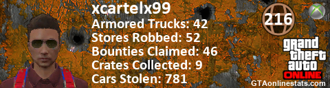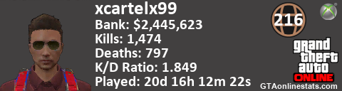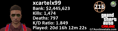 [URL=http://GTAonlinestats.com/showplayer/xcartelx99][IMG]http://GTAonlinestats.com/crimesignature/xcartelx99/sig.png[/IMG][/URL]