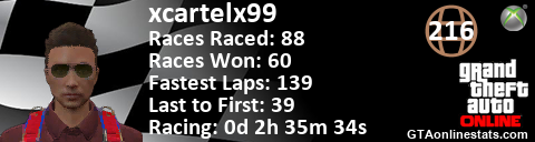 [URL=http://GTAonlinestats.com/showplayer/xcartelx99][IMG]http://GTAonlinestats.com/racesignature/xcartelx99/sig.png[/IMG][/URL]