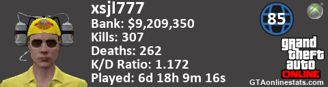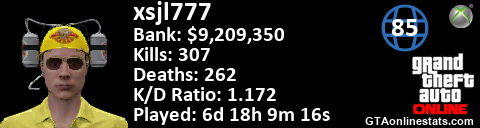 [URL=http://GTAonlinestats.com/showplayer/xsjl777][IMG]http://GTAonlinestats.com/signature/xsjl777/sig.png[/IMG][/URL]
