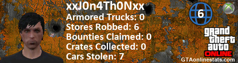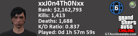 <a href="http://GTAonlinestats.com/showplayer/xxJ0n4Th0Nxx/2"><img src="http://GTAonlinestats.com/signature/xxJ0n4Th0Nxx/2/sig.png" alt="xxJ0n4Th0Nxx" border="0" /></a>