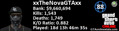 <a href="http://GTAonlinestats.com/showplayer/xxTheNovaGTAxx"><img src="http://GTAonlinestats.com/dmsignature/xxTheNovaGTAxx/sig.png" alt="xxTheNovaGTAxx" border="0" /></a>