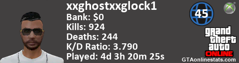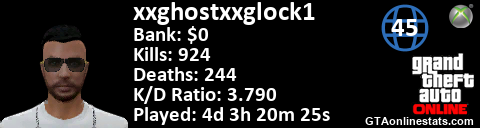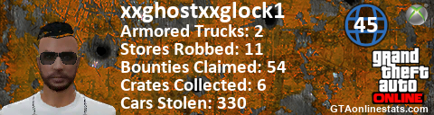 <a href="http://GTAonlinestats.com/showplayer/xxghostxxglock1"><img src="http://GTAonlinestats.com/dmsignature/xxghostxxglock1/sig.png" alt="xxghostxxglock1" border="0" /></a>