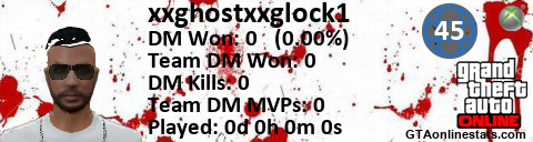 [URL=http://GTAonlinestats.com/showplayer/xxghostxxglock1][IMG]http://GTAonlinestats.com/greysignature/xxghostxxglock1/sig.png[/IMG][/URL]