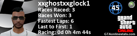 <a href="http://GTAonlinestats.com/showplayer/xxghostxxglock1"><img src="http://GTAonlinestats.com/racesignature/xxghostxxglock1/sig.png" alt="xxghostxxglock1" border="0" /></a>