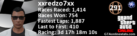 [URL=http://GTAonlinestats.com/showplayer/xxredzo7xx][IMG]http://GTAonlinestats.com/racesignature/xxredzo7xx/sig.png[/IMG][/URL]