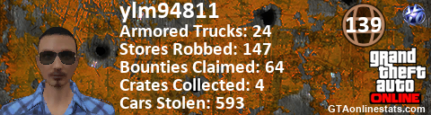 [URL=http://GTAonlinestats.com/showplayer/ylm94811][IMG]http://GTAonlinestats.com/crimesignature/ylm94811/sig.png[/IMG][/URL]