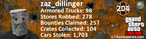 [URL=http://GTAonlinestats.com/showplayer/zaz_dillinger][IMG]http://GTAonlinestats.com/crimesignature/zaz_dillinger/sig.png[/IMG][/URL]
