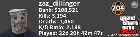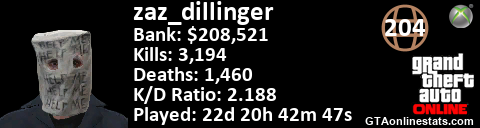 <a href="http://GTAonlinestats.com/showplayer/zaz_dillinger"><img src="http://GTAonlinestats.com/randomsignature/zaz_dillinger/sig.png" alt="zaz_dillinger" border="0" /></a>