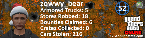 <a href="http://GTAonlinestats.com/showplayer/zowwy_bear"><img src="http://GTAonlinestats.com/crimesignature/zowwy_bear/sig.png" alt="Zowwy_Bear" border="0" /></a>