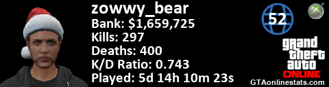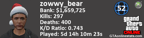 <a href="http://GTAonlinestats.com/showplayer/zowwy_bear"><img src="http://GTAonlinestats.com/randomsignature/zowwy_bear/sig.png" alt="Zowwy_Bear" border="0" /></a>