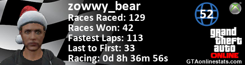 <a href="http://GTAonlinestats.com/showplayer/zowwy_bear"><img src="http://GTAonlinestats.com/racesignature/zowwy_bear/sig.png" alt="Zowwy_Bear" border="0" /></a>