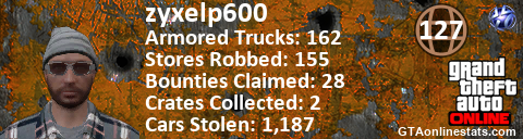[URL=http://GTAonlinestats.com/showplayer/zyxelp600][IMG]http://GTAonlinestats.com/crimesignature/zyxelp600/sig.png[/IMG][/URL]