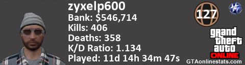 [URL=http://GTAonlinestats.com/showplayer/zyxelp600][IMG]http://GTAonlinestats.com/randomsignature/zyxelp600/sig.png[/IMG][/URL]