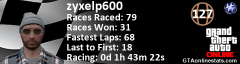 [URL=http://GTAonlinestats.com/showplayer/zyxelp600][IMG]http://GTAonlinestats.com/racesignature/zyxelp600/sig.png[/IMG][/URL]