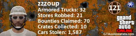 [URL=http://GTAonlinestats.com/showplayer/zzzoup][IMG]http://GTAonlinestats.com/signature/zzzoup/sig.png[/IMG][/URL]